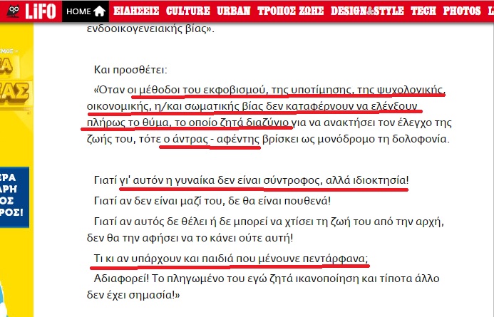 Αποκλείει δηλαδή τελείως σεξιστικά η Γ.Γ. Ισότητας το γεγονός ότι στην Ελλάδα υπάρχουν και ΕΚΑΤΟΝΤΑΔΕΣ γυναίκες που έχουν διαπράξει δολοφονίες κατά των συζύγων/συντρόφων τους, με πρόσφατο θύμα τον αδικοχαμένο διαζευγμένο πατέρα που η πρώην σύζυγός του τοποθέτησε το πτώμα του στην κατάψυξη του σπιτιού, του αφαίρεσε ΧΙΛΙΑΔΕΣ ευρώ απο τον τραπεζικό του λογαριασμό και πήρε το παιδί του και το εξαφάνισε στην Βουλγαρία, ενώ ακόμη την αναζητούν οι αστυνομικές αρχές.